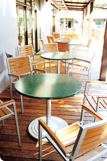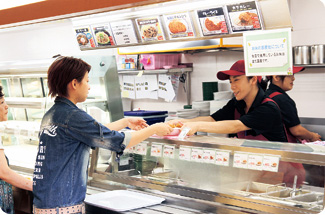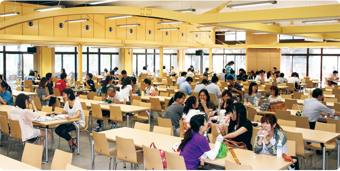 ホールのポイントは、テーブルとテーブルの 間隔を広く取って、トレーを持って楽に歩けるようにしたことです。そのため、ホールの席数が減ってしまいましたが、テラスに椅子、テーブルを増やして席数を確保しています。東京学芸大 学の学生はあまり席取りをしません。また、席を 詰めて座るので、テーブルの間が広くなったこと は大歓迎されています。 食堂だけでなく、購買部、書籍部も店内内装 工事を終えました。 食事以外でも、空調の効いたホールで、購買店舗で買ってきたものを食べながら仲間と話をしたり、パソコンを開いて課題に取り組んでいる 姿を見かけます。生協学生委員会のメンバーは、 「きれいに、快適になって、食堂ホールだけでなくキャンパス内のコミュニケーションが広がったように思います」と、感想を述べています。