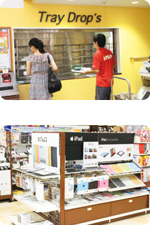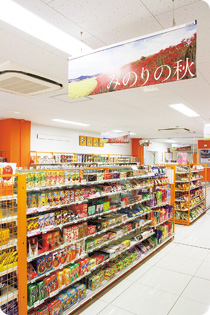 1 階の購買店舗。明るいオレンジを基調としています