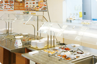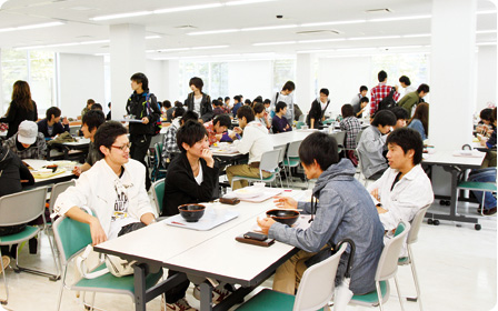 2011年6月に増床し、完成した新ホールでは、お昼にカレーや丼など゙のメニューを提供しています。スクリーンや音響設備もあるので、説明会、イベント、懇親会などの申し込みも増えています。これからも、「より快適に・より楽しく・よりおいしく」食事をしていただけるよう努めていきたいど思います。