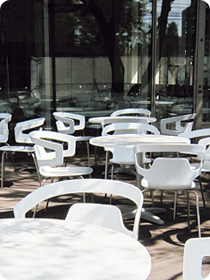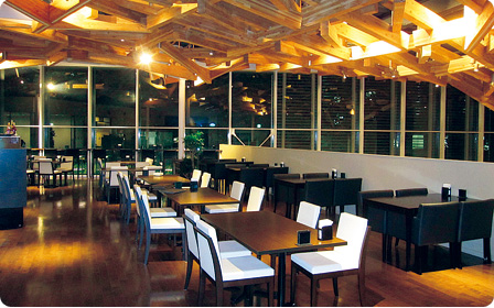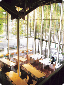 吹き抜けのある開放的な空間に、東南部分が一面ガラス張りで゙、天井が太い木材で立体的に組まれた構造は外の街路樹と一体感が゙あり、まるで森の木陰にいるような雰囲気を味わうことができます。
