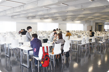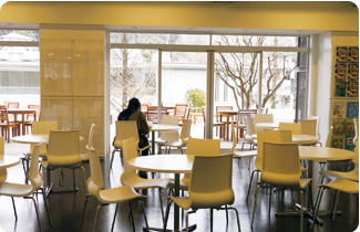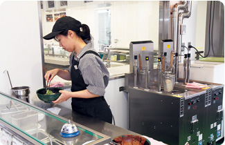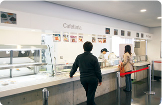 新総合棟完成に先立つ、09年11月、新食堂の営業がスタートしました。新食堂はカフェテリアコーナー、丼・カレーコーナー、麺 コーナーに加えて、ビュッフェコーナーを新設。 ビュッフェコーナーでは、サラダバーと、さまざまなメニューを適温で提供でき、メニューのバリエーションも増えました。好みの料理を食ベたい量に合わせて調整できるようになり、大変好評です。