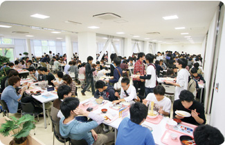 大学会館の耐震工事は2012年3月初旬に完了し、2012年4月5日(入学式前日)に全店オープンする運びとなりました。グランドオープン前の3日間のプレオープン(通常価格の半額提供)に始まり、新入生歓迎のさまざまなイベントに真新しい食堂を利用していただきました。