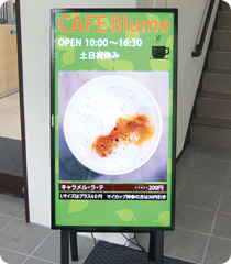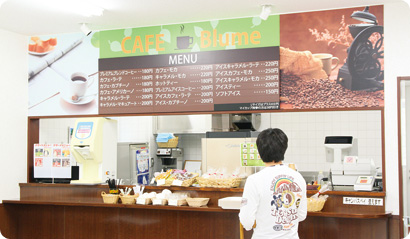 入口脇にあるカフェ「ブルーメ」 マイカップで30円引きに