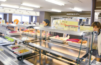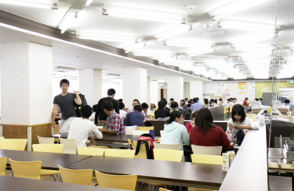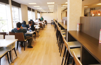 学友会館の食堂も全面改装しました。利用人数が一番多い2階カフェテリアは、席数を増やし、明るい雰囲気・広々とした空間に生まれ変わり、2階北側は一人席も多く設置し、週代わりでメニューを出す、女子学生にも好まれるフェイバリットホールになりました。3階バイキングは、ビュッフェ台を導入し、名物の天津飯とツーオーダーメニューでできたての味が人気です。全体で利用人数も1日200人程増えました。