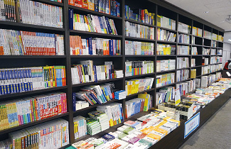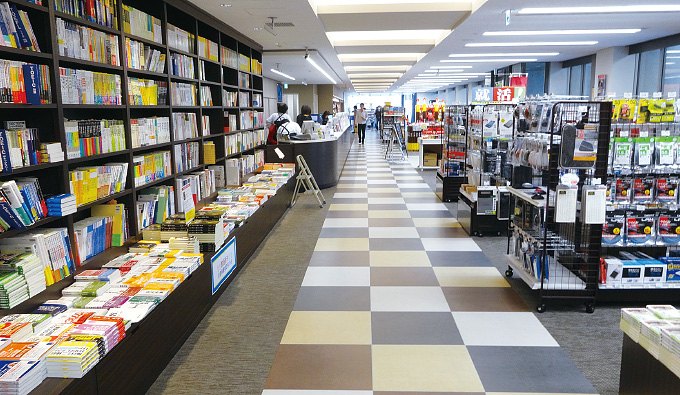 特徴として、店舗の中心にカウンターを大きく設置し、チェックアウトと客注対応を集中して行う方式を採用しました。横に長い構造なので、入り口から左右にコリドー(廊下)を設け、店内が奥まで見渡せるようになっています。店の奥には、56㎡のイベントスペースを設け、新学期の教科書販売や各種説明会、サンプリングなどのイベントなどを行っています。