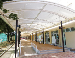 キャノピーの奥に食堂、右手に書籍店・購買店が並びます