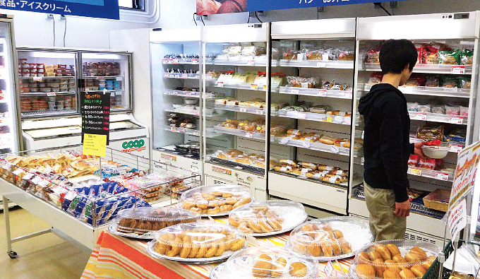 部門は購買・食堂・書籍・サービスの4部門で、2013年8月に購買・書籍をリニューアルしました。リニューアルポイントは、ピーク時間帯に購買レジに常に20人くらい組合員の方が待っているのを解消するためにレジを1台追加して混雑緩和を図った点、また自炊生が多いので冷凍食品ケース・冷蔵ケースの什器の追加と、店舗としての弱点を解消しました。