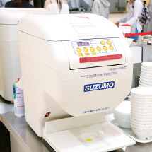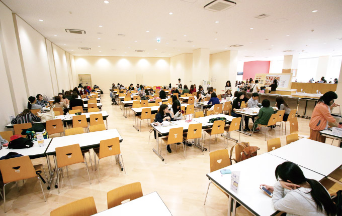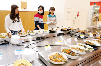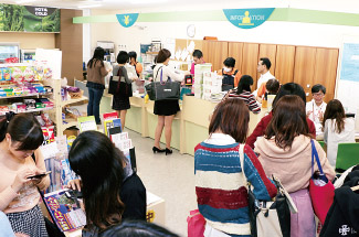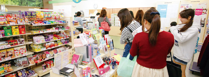 食堂は広くなり、出食レーンとして、ビュッフェ、丼、麺を配置しています。利用者の半数はビュッフェの利用で、バランスや量を自分でコントロールして食事を選ぶことができます。 購買複合店は文房具、パソコン、書籍はもちろん、化粧品まで揃えています。昼の弁当や食品の利用、検定や教習所、旅行申し込みなどで毎日混雑しています。店舗は以前より狭くなりましたが、サービスカウンターの活用で工夫しています。