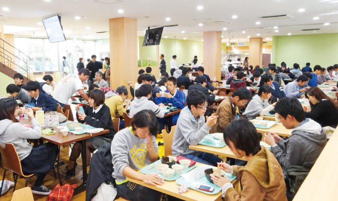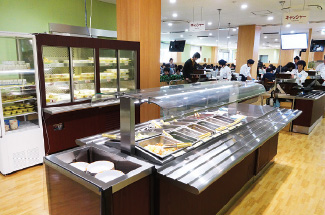 新会館は1F食堂、2F購買と多目的ホール(喫食スペース、懇親会など)となっており、席数が438席から511席に増えました。またデジタルサイネージやLED照明、音響設備などを導入し、利用環境が改善されました。厨房設備では、ライスロボ、スープロボなどを導入しており、労働環境も改善されました。