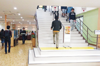 食堂横の階段は混雑を避けるため一方通行。2階に上がると購買と多目的ホールです