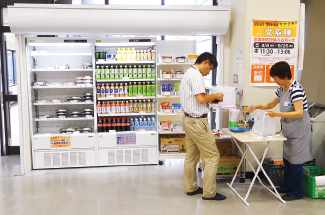 6月以前は平机1本借りて昼食時に弁当販売のみ同じ場所で行ってはおりましたが、「飲料が飲みたい」「お菓子やデザートも食べたい」というご要望もあり、大学へ小さな冷蔵庫が入る位の店内スペースを借用し6月からオープンいたしました。小さな店舗で職員と組合員の距離も近いことから、フレンドリーな接客で組合員の心も掴んでおります。