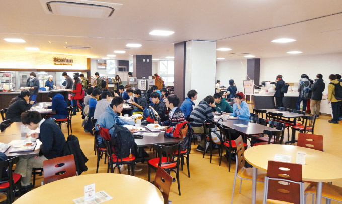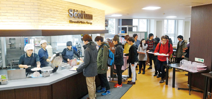 Scorum(スコーラム)はもともとは1972年に喫茶として営業を開始しています。名前は、schoolとforumを合わせた愛称として名づけられました。新しく生まれ変わった今でも、学生・教職員が学内で情報を交換しあえる憩いの場として親しまれています。