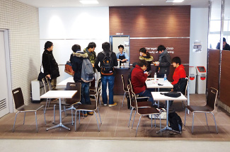 入口前にはラウンジがあり、食事・交流ができます 電子レンジ・コピーなどのサービスも