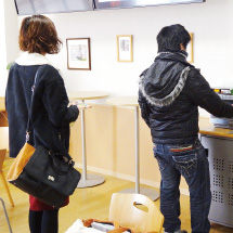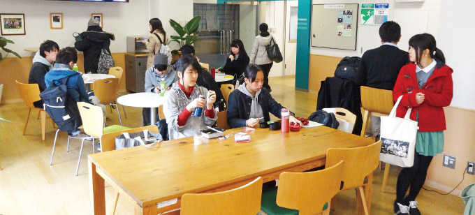 2014年秋晴れの10月7日(火)、人文学部校舎1階の学生ラウンジ内に、「大学生協人文プチショップ」がオープンしました。このショップは、翠陵店や第1食堂などの学内食堂が非常に混雑する中、学生の食事時間の確保と利便性を向上させることを目的に、人文学部と大学生協が話し合いを進め、準備をしてきました。