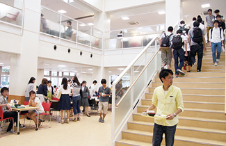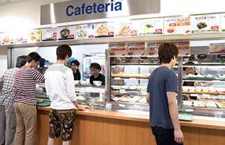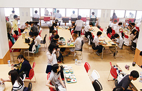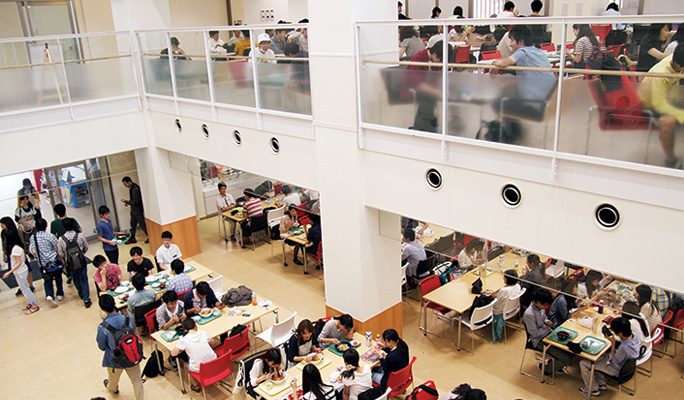 この改修で食堂では念願の席数増がかない、1・2階合わせて701席となりました。吹き抜けのあるホールは明るく開放感に満ち、カフェテリア形式で好みの食事を選べます。