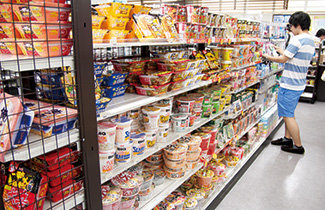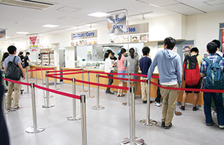 出食コーナーでは、混雑緩和のためカフェテリア列と丼・麺の列を分けています