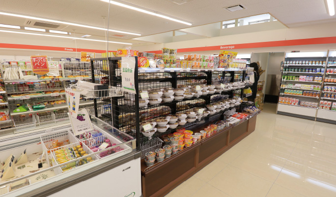 皎皎舎は、日常ゾーンと勉学ゾーンに分かれます。日常ゾーンは本格的な厨房を備え(将来惣菜の調理を目指す)、お米や野菜などを含めた自炊用食材を取り扱っています。また、ディッピングアイス・ソフトクリーム・本格的なカフェマシンを備え、広い張り出しスラブに配置したベンチやイスでゆったりとくつろぎながら飲食することができます。