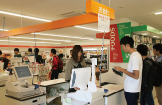 勉学ゾーンは2万点の書籍を陳列でき、旅行・住まいの斡旋・共済対応・保険代理店業・公費など、大学生協の基本事業を広く取り扱っています。
