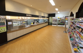 出食レーン 手前から麺コーナー、カフェテリア、カレー・丼コーナー 対面に食品コーナーがあります