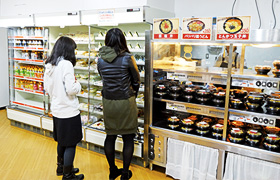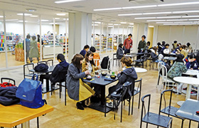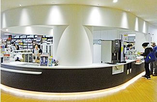 SHOPは、旧店舗に比べて約2.3倍の大きさになりました。廊下側は全面ガラス張りで見通しも良く、広々とした空間で毎日2,000人以上の利用があります。店舗はブーメランのような形状で、中心となる部分に組合員の全ての要望を受け止めるかのような楕円形の中央カウンターを設けました。廊下を挟んだ店舗の向かい側には多目的スペースを配置し、通常期は食事のできる空間として、新学期はパーティションで仕切って新入生センターや教科書販売コーナーとしても活用できるようになっています。