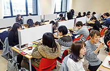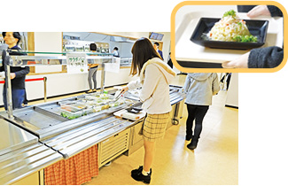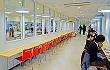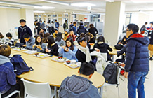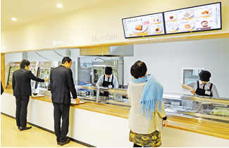 新食堂は他の2食堂を合わせた広さがあり、最新の厨房機器やデジタルサイネージを導入し、毎日1,000人以上の利用があります。元祖100円朝食もここで提供しています。デーブルも一人席、仕切りのある席、分割可能な大テーブルなどを配置して、さまざまなニーズに応えられるようにしています。営業終了後はホールを開放しており、皆さん思い思いの時間を過ごしています。