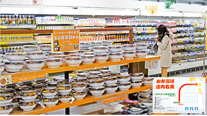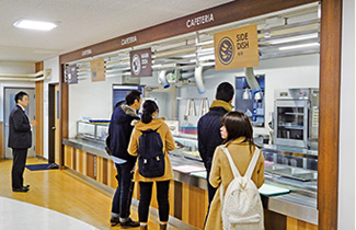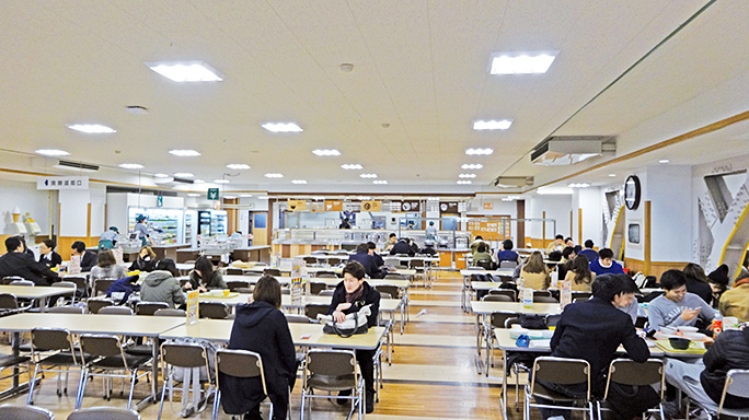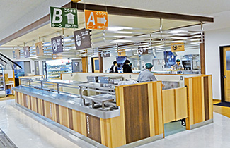 食堂は、かつてAB二つのレーンが向かい合わせにありました。しかし、Bレーンは利用者側から死角になっており、利用比率が9:1とアンバランスだったため、組合員から混雑改善の要望が常に出されていました。そこで、天井まであった壁を取り除き、Bレーンをオープンキッチンにして視認性を高め、利用しやすくしました。現在はバランスよく利用され、利用比率も6:4にまで改善されています。 床、天井、照明、クロス、エアコンも新装され、学生にも大変人気です。