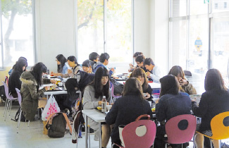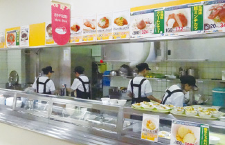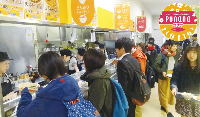 今回の改装の特徴は、①食堂はレジ精算をショップと統合し、定食メニューの券売機による食券制から、カフェテリア方式に変更。合わせてミールカードのサービスも導入しました。②既存施設内で席数を1.5倍に増やしました。これにより改装前よりもショップのフロア面積は減りましたが、法科大学院生向けの専門書は在庫冊数を維持しています。③昼食時の混雑をカバーするため、近接の霞キャンパス食堂で製造した生協弁当等を未来創生センター1階ロビーで販売しています。④リニューアルの記念に店舗愛称を組合員から公募し、「プナナ」と決定しました。ハワイ語で「集まる場所」という意味で、華やかなロゴマークも作成しました。