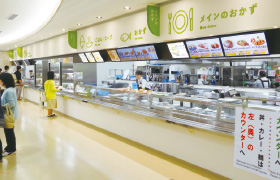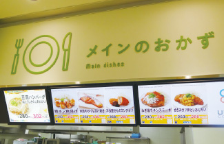 メニューの掲示は、出食カウンター上部のメニューボードにデジタルサイネージと導光板を設置し、入口通路の大型サイネージと合わせて見やすさを追求しました。