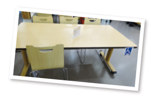 机・碕子は木目調に統一した上で、机は脚の出し入れがしやすいT字脚にし、椅子は背もたれにカバンが掛けやすい仕様にし、利用しやすさを追求しました。