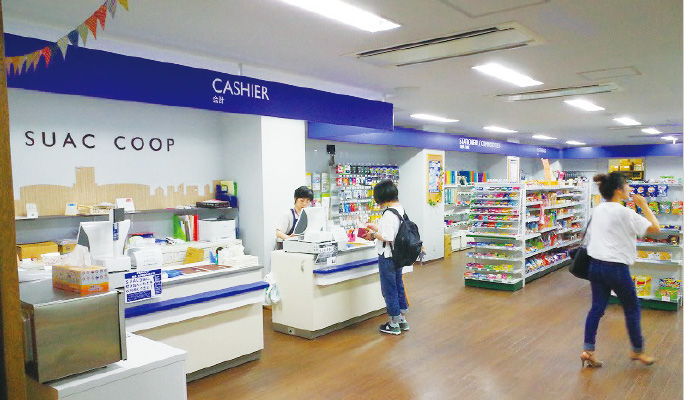 購買書籍店では、利用者の動線が交錯しにくいように販売機器や什器の配置を改めました。内装も本学のコーポレートカラーであるSUACブルーを基調とした、爽やかなイメージに変更。こだわりの教材コーナーでは、利用者へのアンケートやヒアリングをもとに品揃えを一新したほか、学生でも手に取りやすい価格の商品を採用し、店頭に揃えました。
