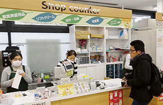 レジ横のShop Counterでは、実習用品・ソフトクリーム・宅配便・ランドリーなどのサービスも