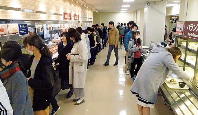 鶴甲第一キャンパスでは、全1年生と一部の2年生の共通授業(語学や教養言論等)を行っています。恐らくほとんどの1年生が初めて利用する生協食堂ではないでしょうか。1年生は不慣れなことと、鞄等を預けられないので、他キャンパスよりも混雑は酷い状態です。このため、既存レーンの対面に新たにレーンを増設してWレーンとし、提供メニューを分けて出食スピードを上げました。また、従来のカフェテリアコーナーも丼・カレーコーナーに改装し、合計3本のレーンでさらなる混雑緩和に努めています。