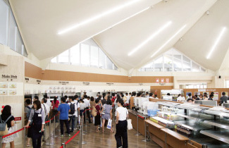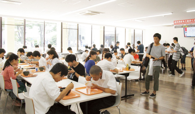 ガラス張りで明るいホール。学内では最も広い食堂です