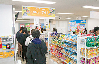 昨年8月より大学主導で食堂フロアの改装工事が行われ、食堂は椅子とテ-ブルで色分けした三つのエリアに分かれています。以前の暗い昔ながらの学食のイメ-ジを一新しました。 食堂の改装に半年遅れ、購買部も2005年以来初めての改装に着手しました。食堂フロアとの一体感を出すため、床材から内装にいたるまでイメージを統一した造りになっています。 教室から生協店舗、食堂への動線も大幅に変更し、行き来しやすいように工夫をしました。今後も一層の努力をして、学生に喜ばれ、さらに利用してもらえる店舗に成長していければと思います。