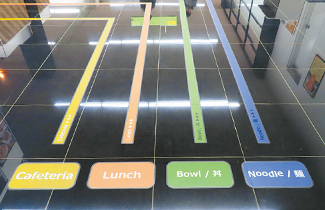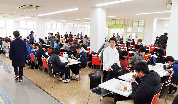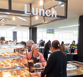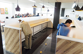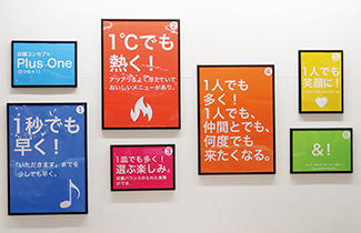 食堂の混雑解消を課題に、2018年10月1日リニューアルオープンしました。店舗改装にあたって、店舗コンセプト「PLUS ONE(5つの+1)」を作成し、お店の設計や運営もこれを実現する仕組みに変更しました。カフェテリア、ランチコーナー(昼のみ、唐揚等人気メニュー定食2種類のみスピード提供)、丼、カレー、麺の5つの食事提供コーナーで待たせない工夫、各コーナーには小鉢などの冷蔵ケースを設置、トレイを置くレジレーンを長くし、利用者の事前準備でスムーズな清算、ホールの通路を広く通りやすく、テーブルも少し小さく2人席を増やして、死に席を減らす。また立食スペースの新設で少しでも早く食べたい人へも対応、給水器の分散設置などの工夫により、席数は4人席中心830から2人席中心770に減りましたが、利用者は改装前+1日50〜150人増えました。利用点数も1人0.8点増えるなど、成果が出ています。引き続き店舗コンセプトに基づく改善を継続して、利用条件の改善と満足度アップに尽力します。