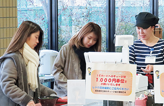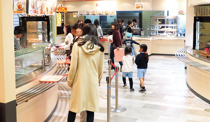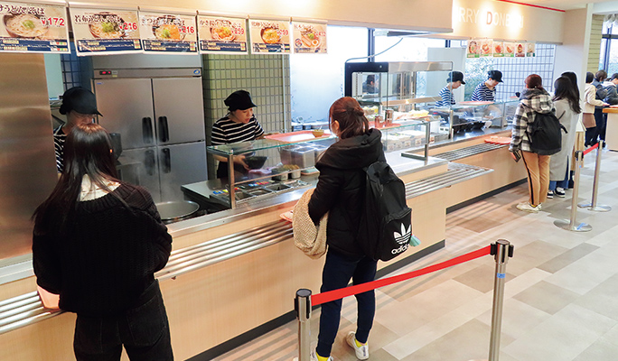 大学のありように沿って、女子学生・教職員・シニア・幼児・児童と様々な方が気持ちよくご利用いただける食堂を目指して、ICプリペイド決済によるレジ精算の時間短縮や品切れ防止・メニューの絞り込みなど日々改善を積み重ねています。