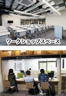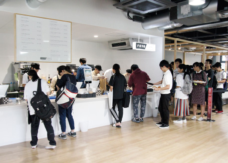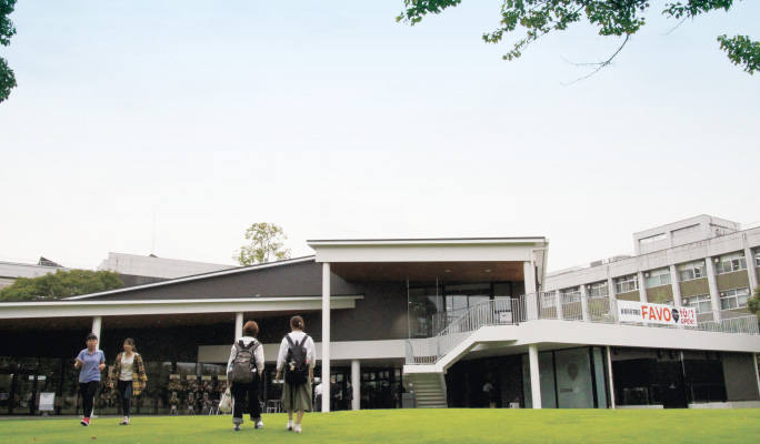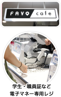 FAVOは吉田キャンパスの中心に位置する2階建ての建物です。1階にはBakery、Box Lunch、One Plate Restaurantの三つのコーナーを備えたカフェテリアと、ミニショップもある多目的ルーム、2階にはサポートカウンターを兼ね備えたBookstoreとWorkshoproomと、小さいながらも複合施設となっています。