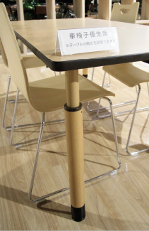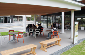 テラス席の木製ベンチは山口大学教育学部附属特別支援学校の皆さんの手作りです