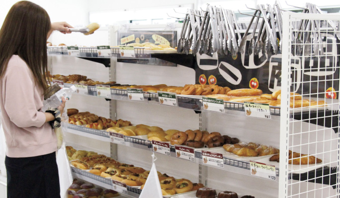 棚は手前から書籍、文具、お菓子類、カップ麺、焼きたてパン、日用品、飲料と並びます
