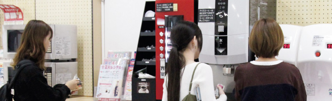 白基調の店内には、木製のカウンター什器を導入し、学生活動を発信できるスペースも新たに整備しました。設備面では棚の後ろから商品を補充できる保冷庫等の設置、荷捌き・在庫置き場の拡充を行いました。組合員の皆さまには大変ご好評をいただいております。