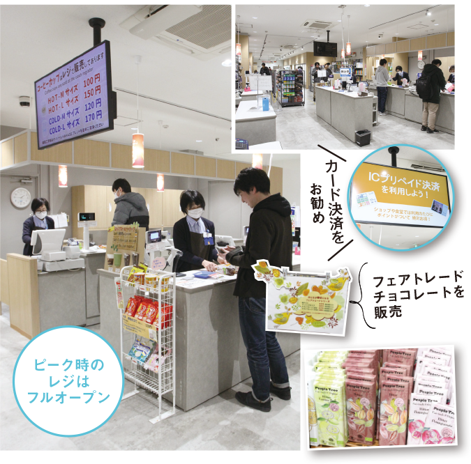店の雰囲気も学生・教職員がホッとできるデザインを基調にしました。今後も組合員の要望に応えられる店舗運営を目指します。