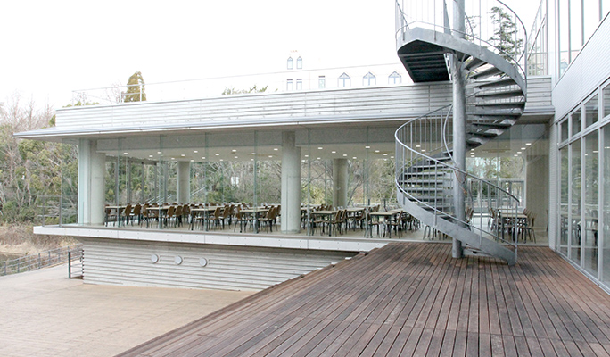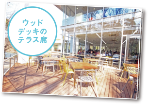 三方がガラス張りで開放感あふれるダイニング。ウッドデッキや周囲の木々とも調和しています
