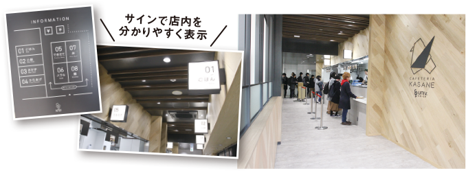 今回の改修では「席数を増やす」 「学生が集える環境づくり」をメインにホールレイアウトや空間演出を行いました。また提供するレーンを3つに分けて並びやすい動線づくりを目指しています。提供するメニューについては他のカフェテリアと同じ基本メニューを中心に据えていますが、ケバブコーナーや学生に人気の唐揚げコーナーなどで特色を出しています。