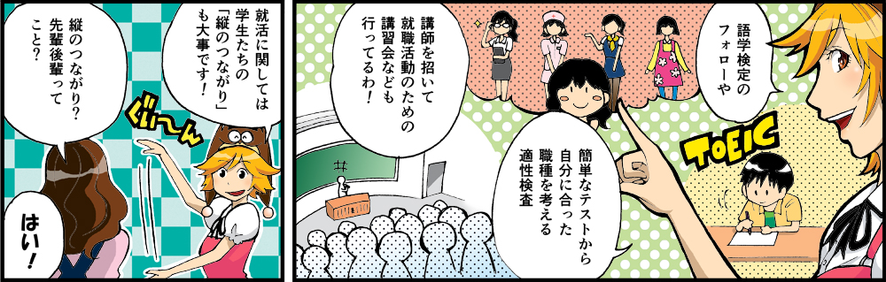 We hold seminars in which senior students who have experienced job-hunting process tell their juniors about their own experience and give advice. In addition, we hold seminars that trigger students to think about work and know about the existing industries in Japan. Some job-hunting support events are developed, planned and operated by the students themselves.
