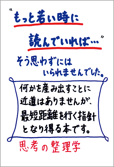 私は書店でこの本を見つけた時、タイトルが「思考の整理学」で、著者が大御所の先生なので、入学したばかりの学生が読むには少し難しいのではないかと思ってしまいました。でも帯のコピーが手書き文字だったので、みんなが手に取っている本なんだと感じることができました。