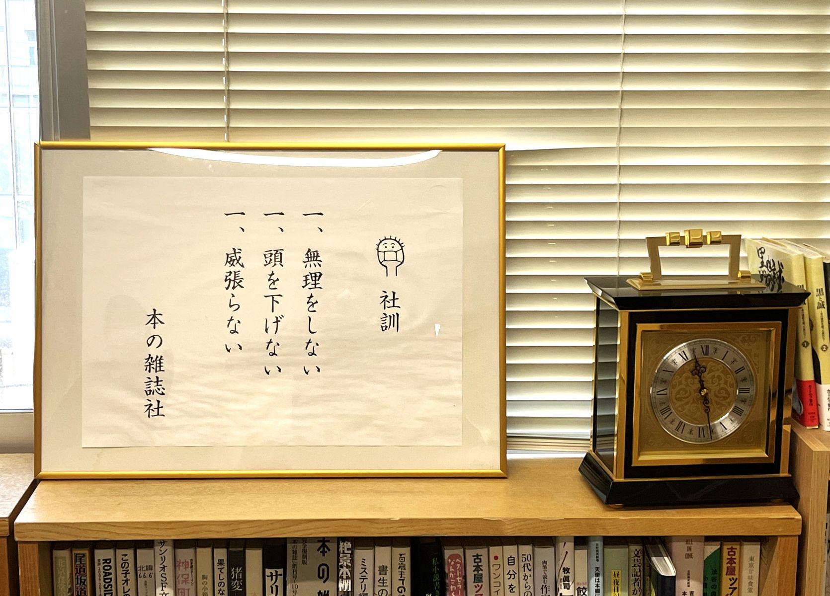 いつからあったのかも分からないくらいに前からあるこの社訓。入ってくる人、働いている人を同じ目線から見守るような角度に立っている。短くてシンプルな社訓だからこそ、頭にストレートに入ってくる。誰かに決められた言葉ではなく、共に本を作ることを通して見つかった原石のような言葉。こんな社訓が生まれたのは、本の雑誌社が、たくさんの人と一緒に、本との出会いを作っていく場所だったからかもしれない。