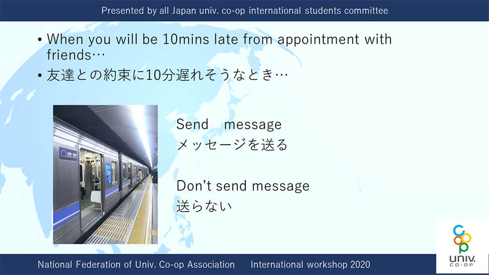 「犬と猫どちらが好きか?」「約束に10分ほど遅れそうな時連絡するか?」など様々なテーマで留学生と国内学生が考えを交流し、お互いの価値観の違いについて理解を深めました。