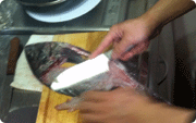 私の食生活は、飲食店でアルバイトをしているため、料理ができるようになり、自分で大体の料理が作れるようになりました。(←左の写真は魚をさばいている様子です。)そのため、30%は自炊をしています。また、30%はアルバイト先で無料で食べられる賄いを食べています。そして、20%は学内の食堂か、お弁当を買っています。残りの20%は友達と外食をしたり、飲み会などでの食事などです。