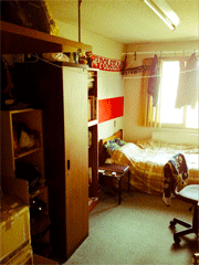 私費留学生なのでバイトなどで忙しくほとんど家にいませんでした。寝ることができて、洗濯ができて、自由時間にゆっくりすることができる場所を探していました。そこで大学の中の寮に移り住むことにしました。個室には浴室はないので、他の人と共用のシャワーを使わなくてはいけません。台所も共用です。私の部屋はとてもせまいですが、私には十分です。ここに寝に帰るだけなので、安いことに満足しています。研究室に長くいて、勉強しようと思いますし、外で友達と一緒に長い時間を過ごそうという気持ちになります。この寮は大学の中にあり、研究室から歩いてたった10分しかかかりません。