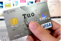 我是大阪大学3年级的学生。2009年秋天开始了在日本的生活。上了大学之后,我加入了生协,经过非常简单的手续办理了TUO卡。它与在银行办理的信用卡完全相同,有VISA可供选择。额度可以从5万,10万和30万日元中间选择,我选择了10万的。我认为一次消费的上限为10万日元,对刚接触信用卡的大学生来说是很合适的。因为在日本国外也可以使用,所以回国的时候也很放心。